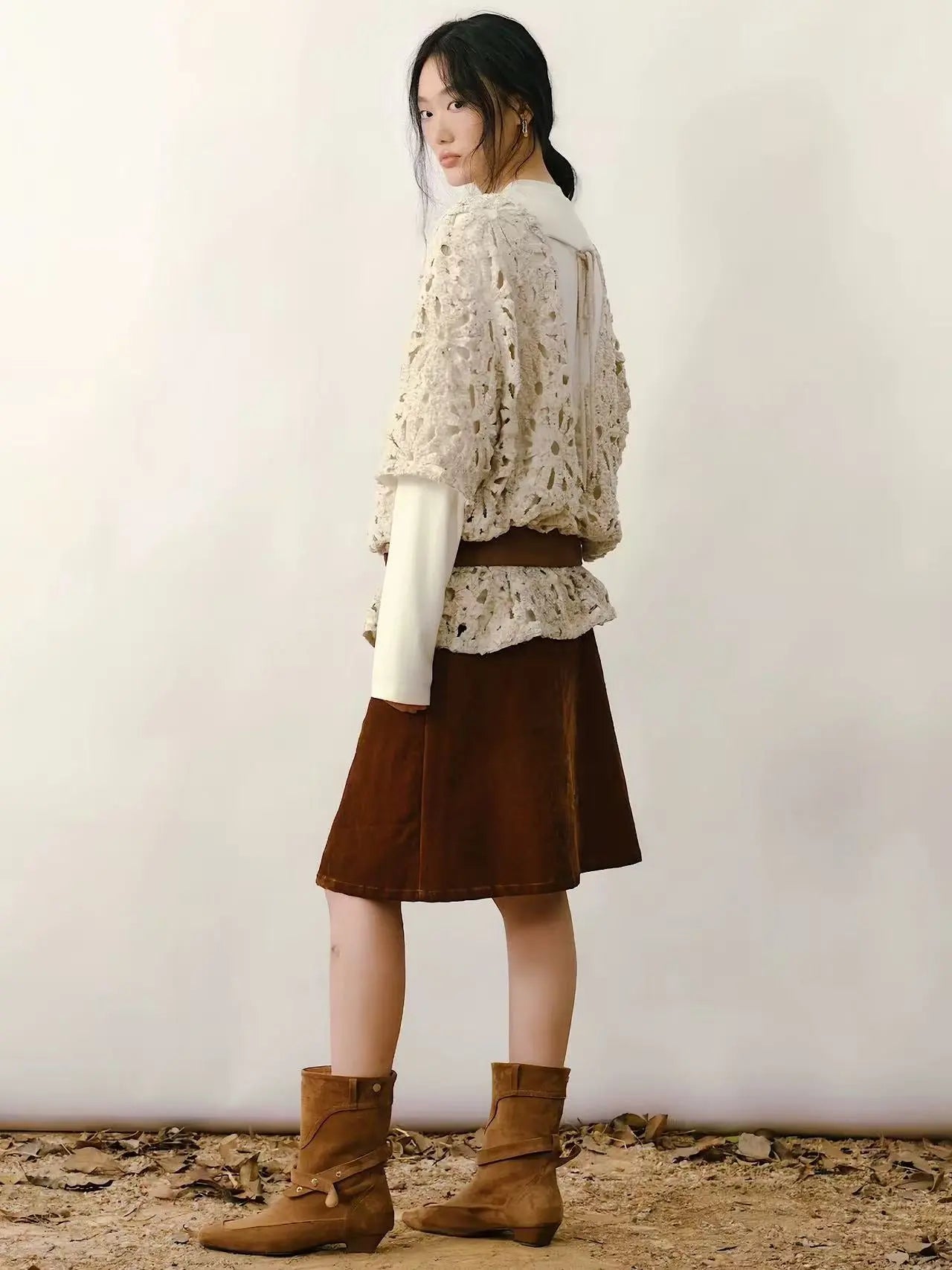 A statement down shirt jacket featuring an all-over floral cut-out design with subtle sequin accents, delivering a textured, handcrafted look. The lightweight padding provides gentle warmth without bulk, while the relaxed silhouette makes it easy to layer for everyday styling. Soft, neutral tones create a refined aesthetic, perfect for elevating casual winter outfits.