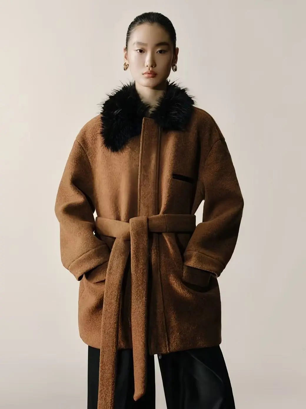Crafted from 100% wool with a rich, textured finish, this coat features a plush faux-fur collar that adds warmth and sophistication. The relaxed, oversized silhouette is balanced with a self-tie belt for adjustable shape, while clean welt pockets and minimal lines give it a refined, modern look. Soft, structured, and easy to layer, it’s an elevated outerwear piece for the colder season.