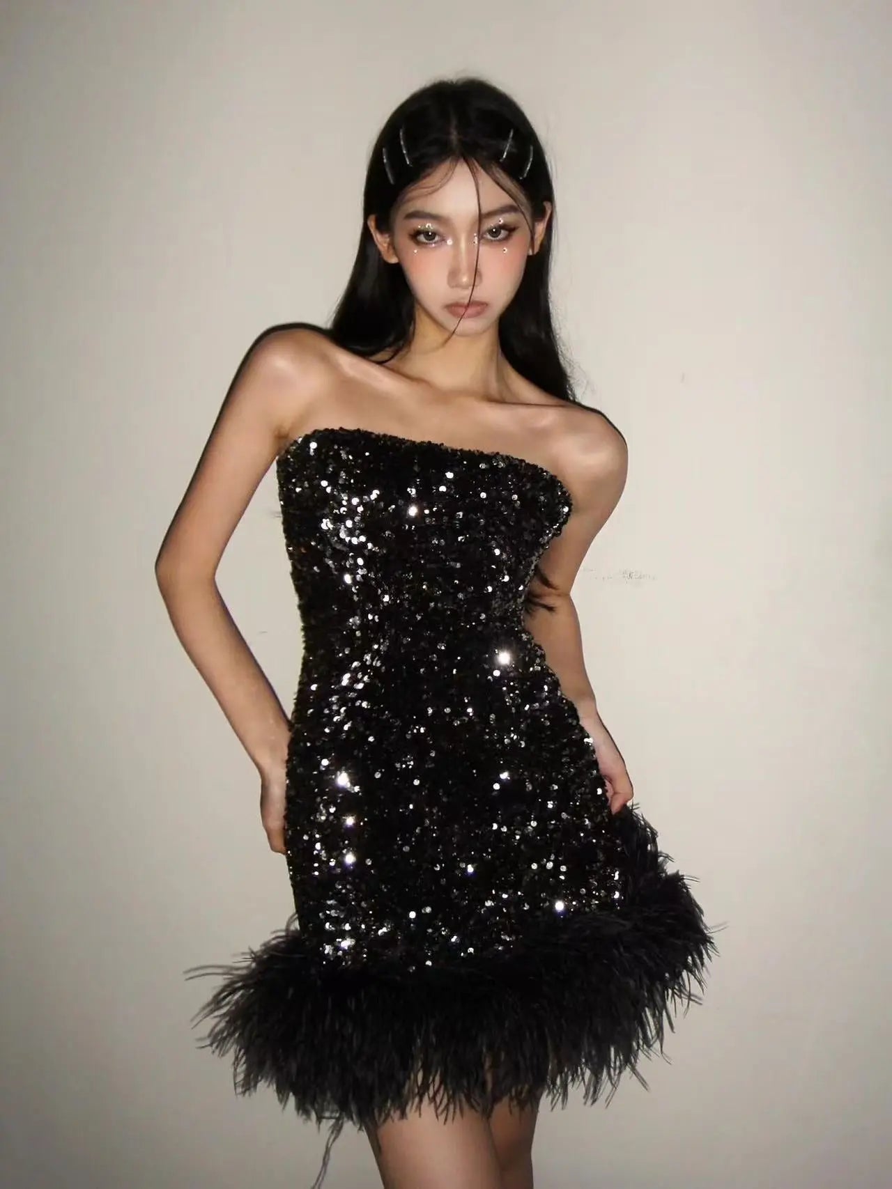Midnight Feather Sequin Mini Dress A statement piece designed for festive nights, this strapless mini dress sparkles with full-coverage black sequins that catch the light from every angle. The fitted silhouette enhances the figure, while the feather-trim hem adds dramatic movement and texture. Perfect for holiday parties or night-out occasions, this dress delivers an elegant yet bold look with undeniable presence.