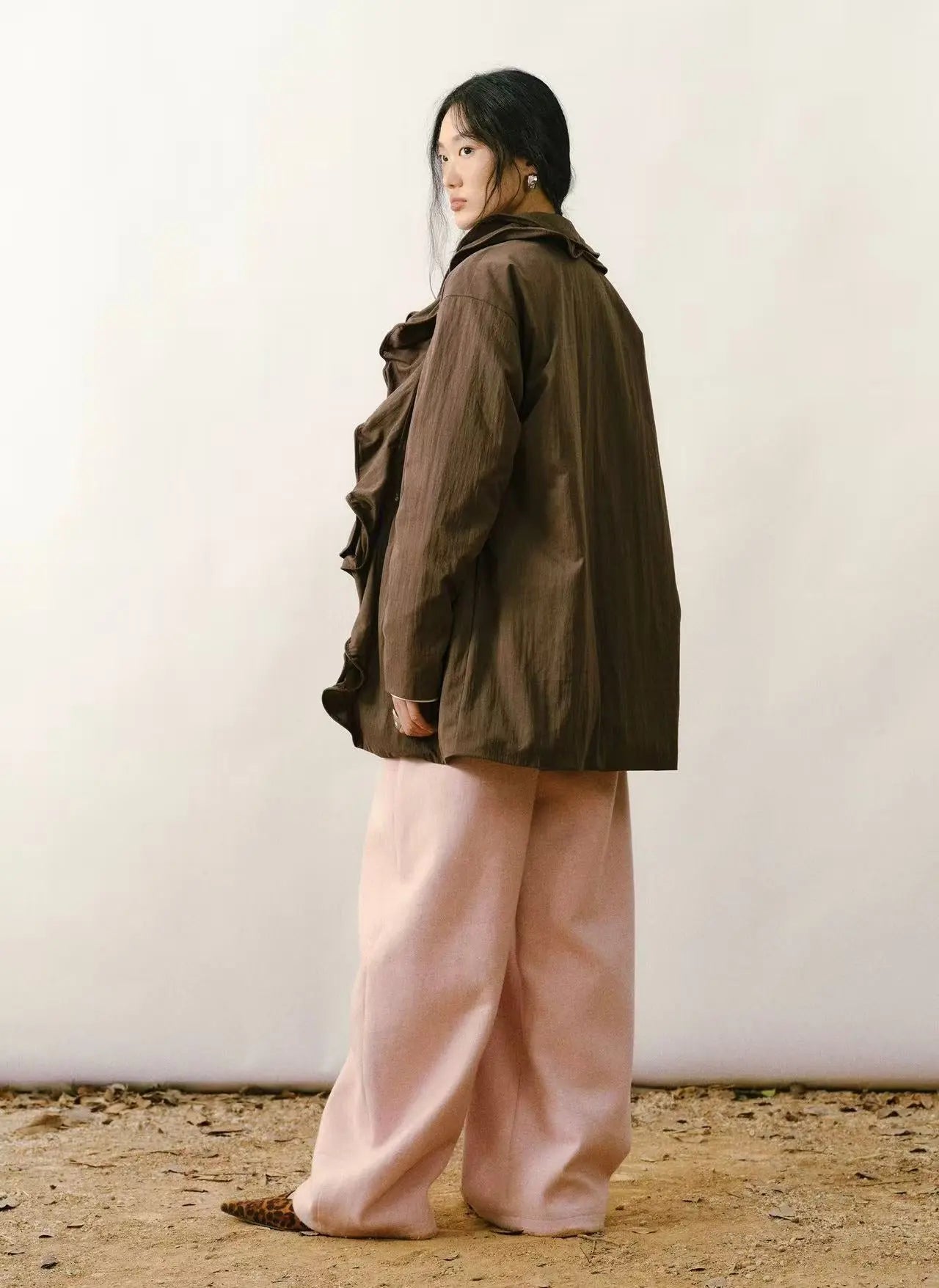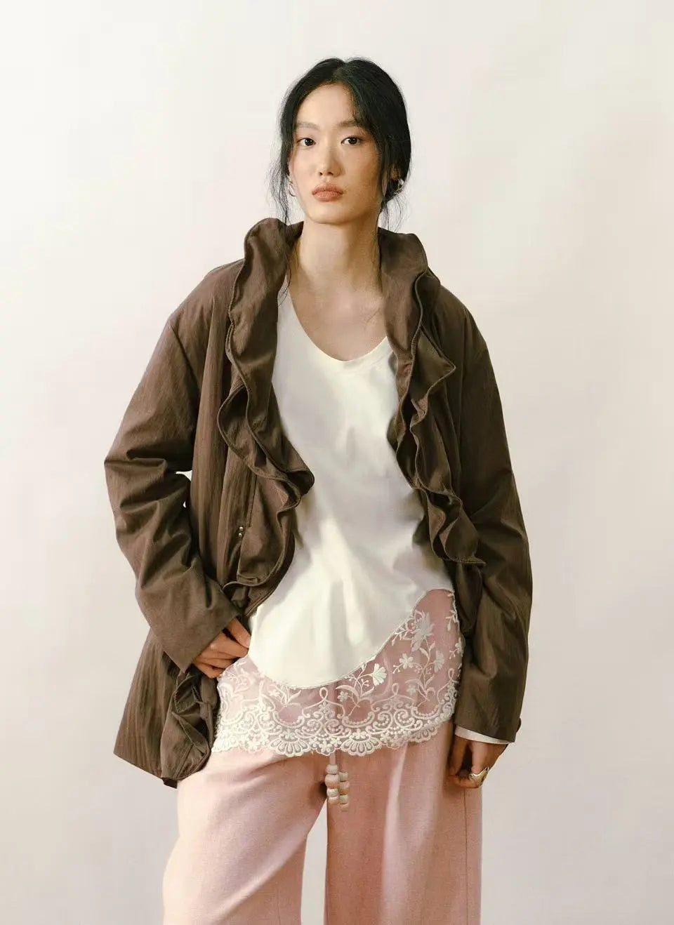 A lightweight down jacket featuring soft, sculptural ruffle trims that add movement and feminine texture. Designed with a relaxed silhouette and subtle structure, it offers both comfort and visual interest. The crisp touch of the fabric balances the romantic edges, making it an easy layering piece for effortless everyday styling. A refined and unique jacket that elevates simple winter outfits with a hint of modern elegance.
