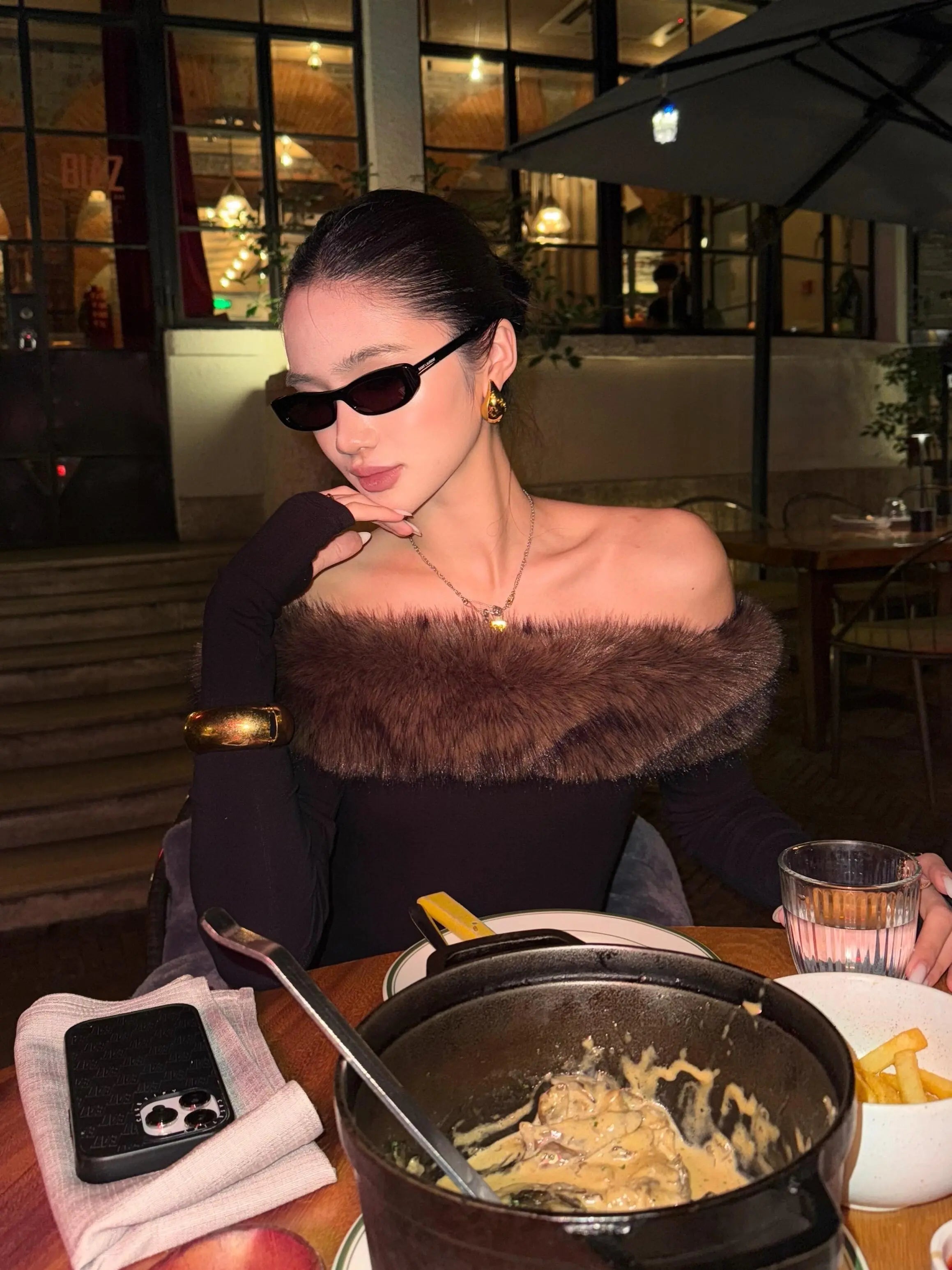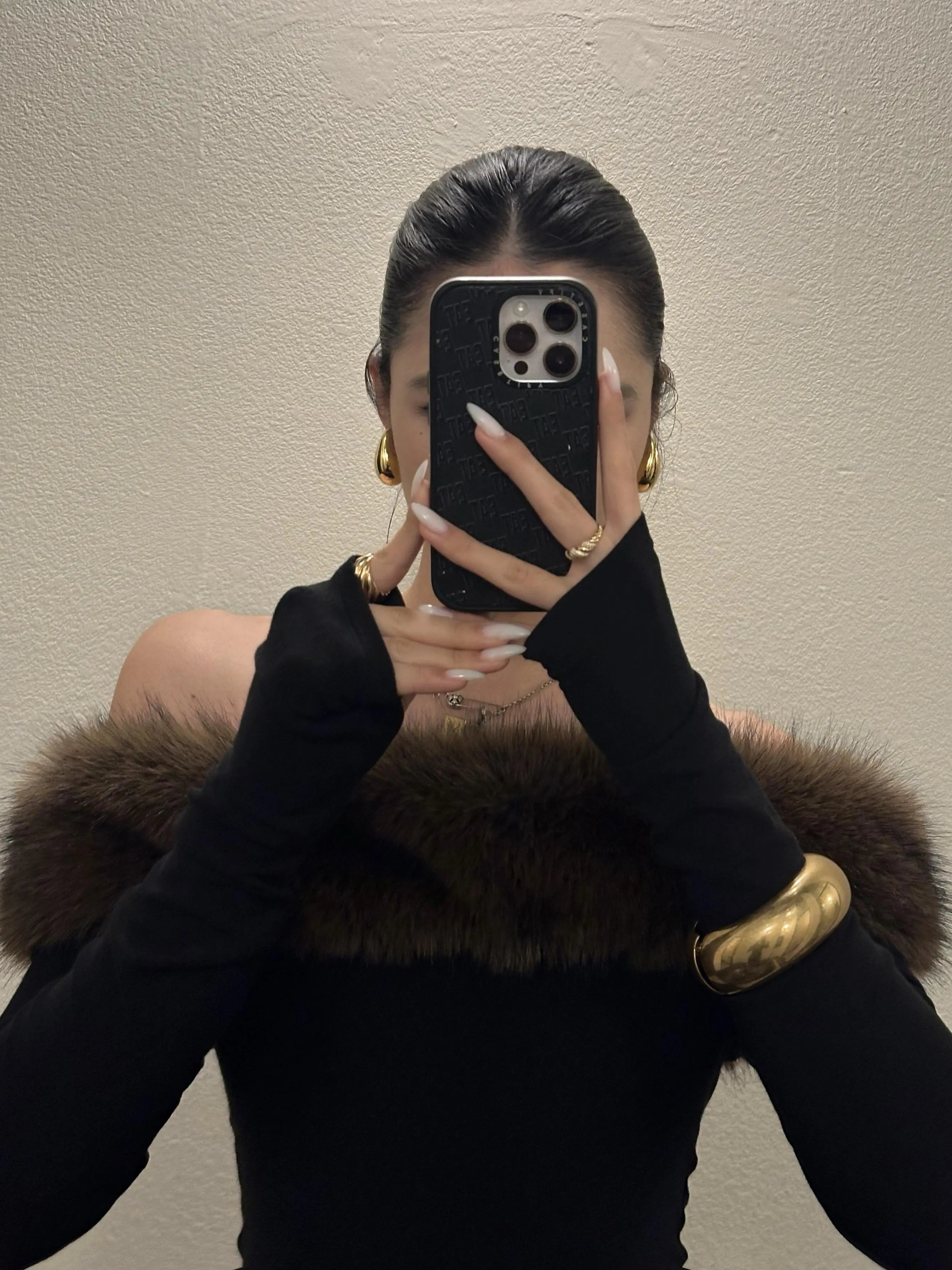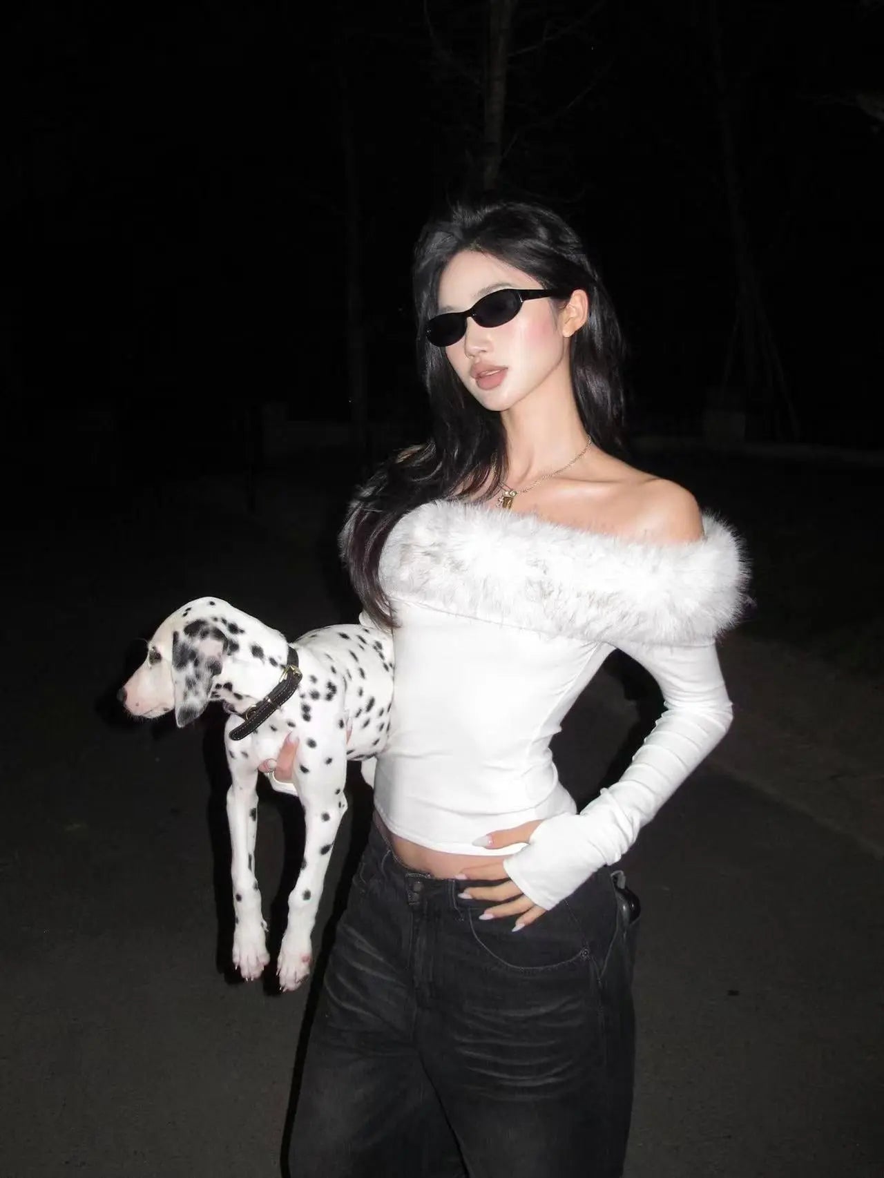 Shibuya A soft, body-skimming off-shoulder tee designed with a bold faux-fur neckline that instantly elevates your look with a touch of playful glamour. The stretch-fit silhouette highlights the waist, while the long sleeves with thumb-hole detail add a sleek, modern edge. Minimalist yet distinctive, this piece brings effortless chic to night outings, casual street looks, and statement layering.