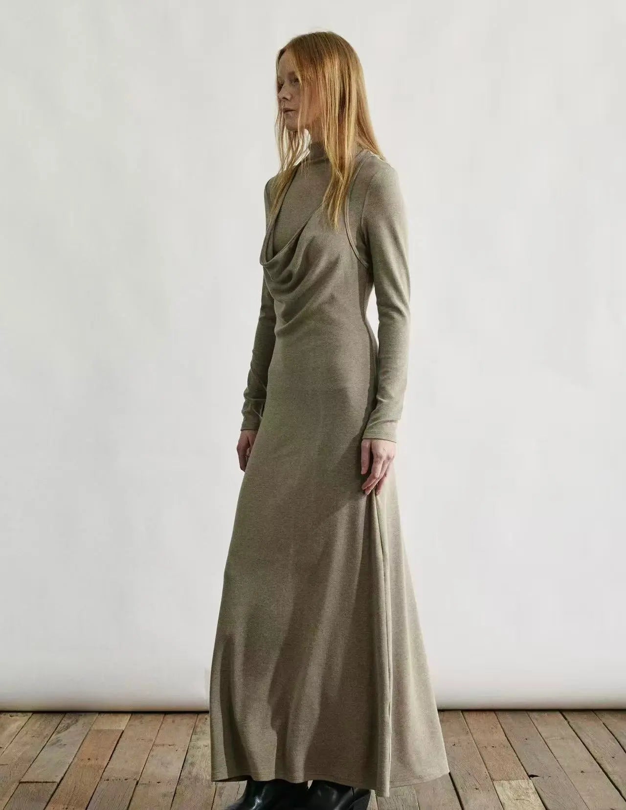 Crafted from a soft, skin-friendly knit with an elegant drape, this dress features a faux two-piece design that enhances dimension while keeping the silhouette sleek. The blended wool content adds warmth, and the draped collar brings a refined, effortless touch. A twisted back detail subtly elevates the structure, while the below-knee length ensures comfortable everyday wear with a polished finish.